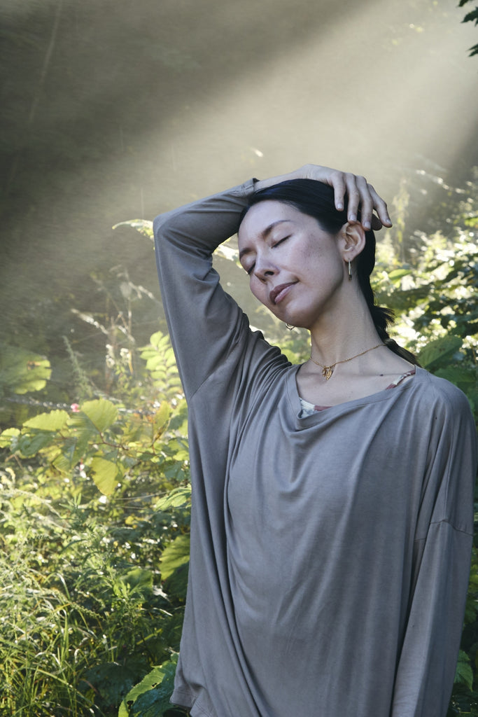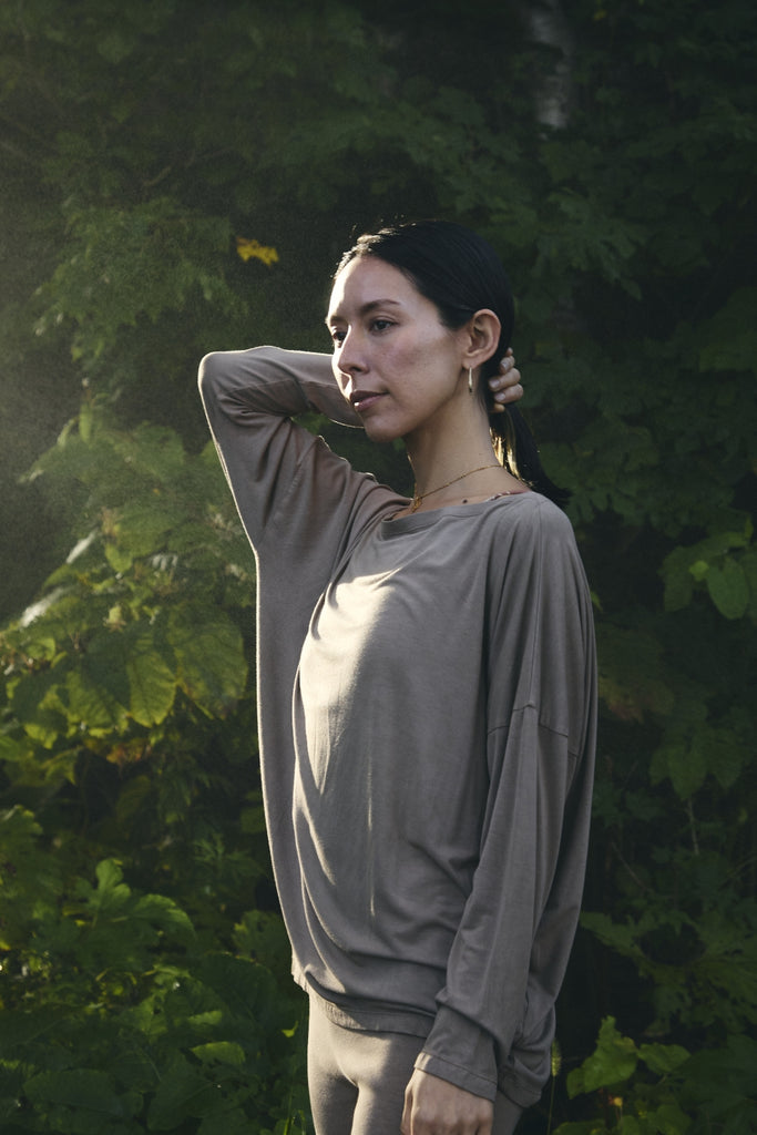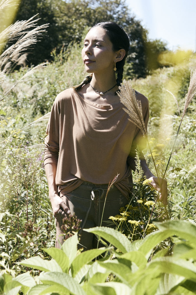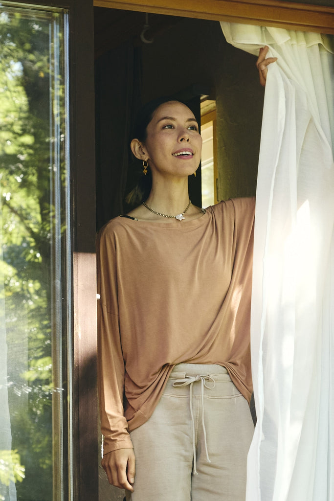 The gentle texture has a heavy texture that moisturizes the skin and blends in with any occasion. The design is simple but has a lot of attention to detail.The boat neckline creates a beautiful collarbone area, and the shoulder area is loose and tapers towards the wrist, creating a beautiful line. The back is long enough to hide your buttocks, and the front is slightly shorter with a soft curve.