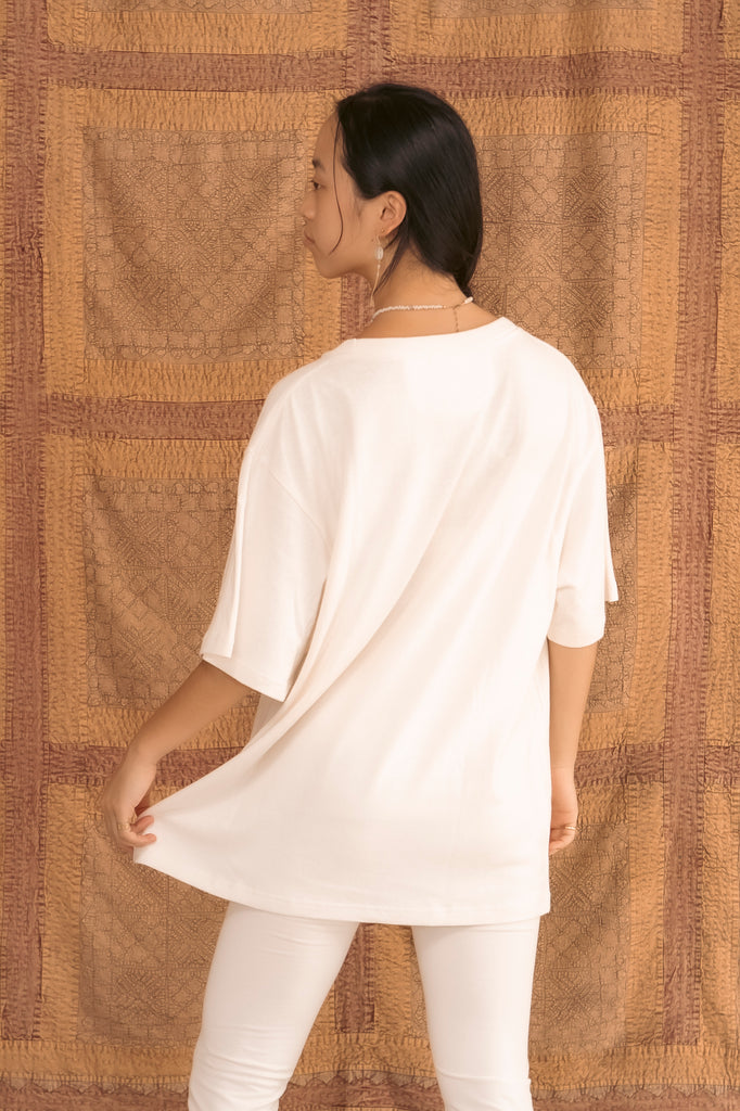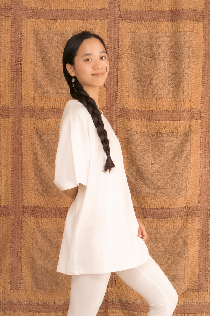 肌にやさしい厚手のヘンプコットンを使用した、ユニセックスのオーバーサイズTシャツ。