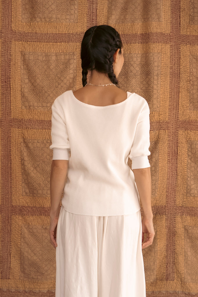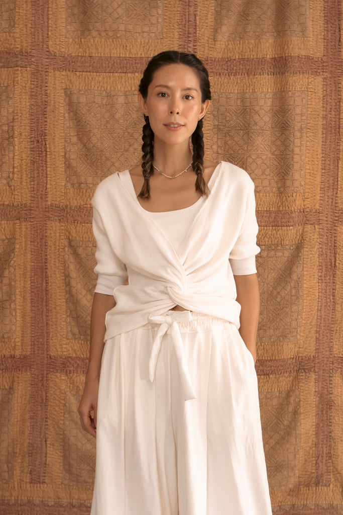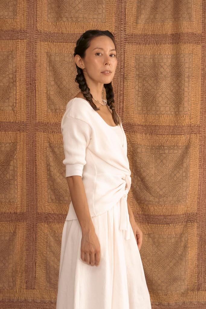 ワッフル生地が印象的で着心地の良い一枚。大きく前にクロスしたデザインはギャザーがウエストの少し上に来るので全身のスタイルアップの印象に。