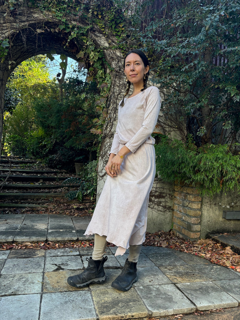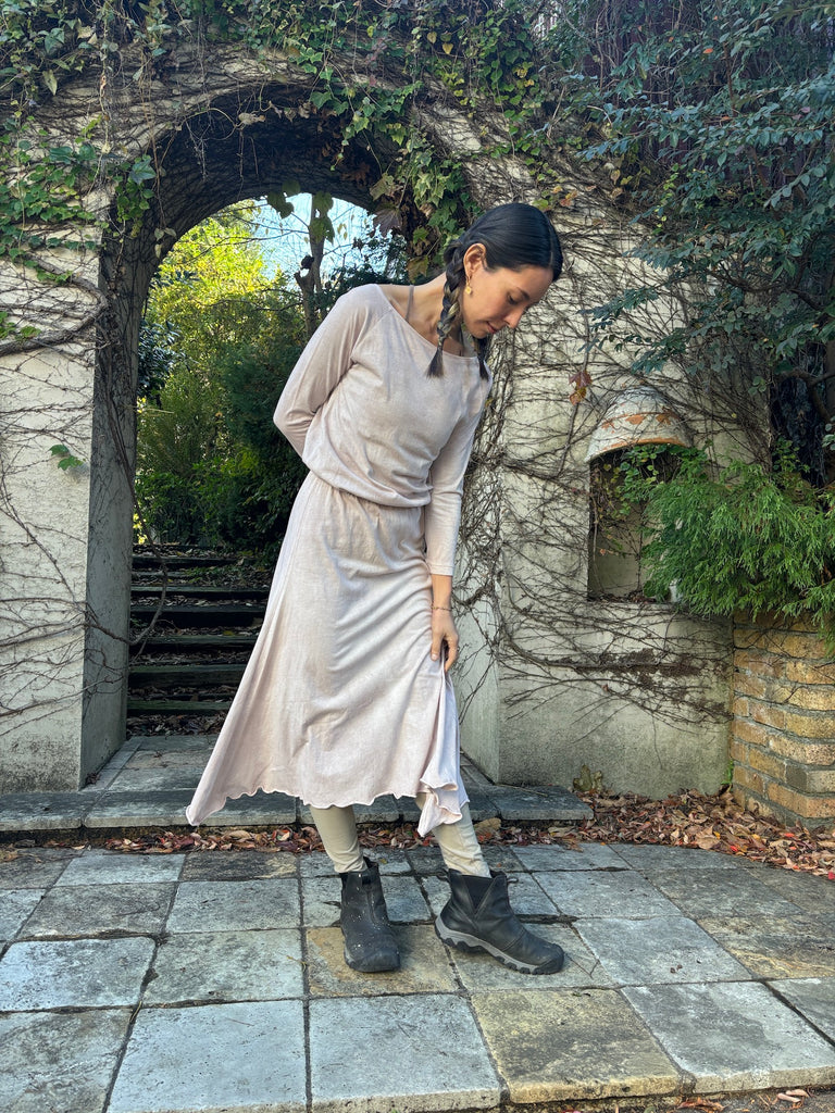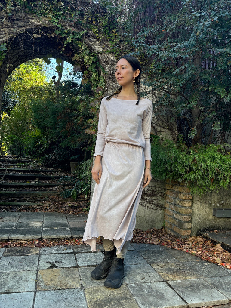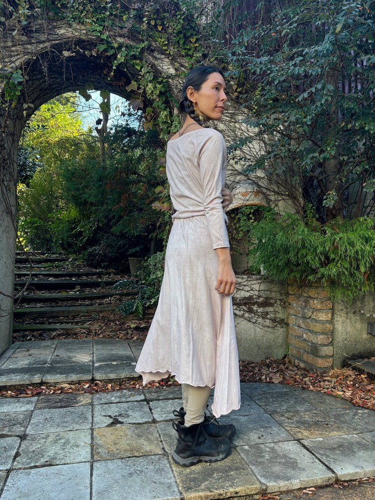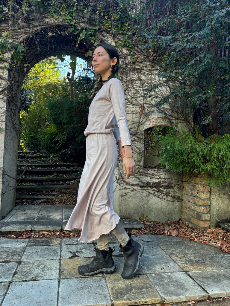 The discreet opening at the neck that makes your neck look beautiful, the sleeves that create a slender arm line, and the Goddess silhouette that spreads loosely from the cinched waist will lift your mood.