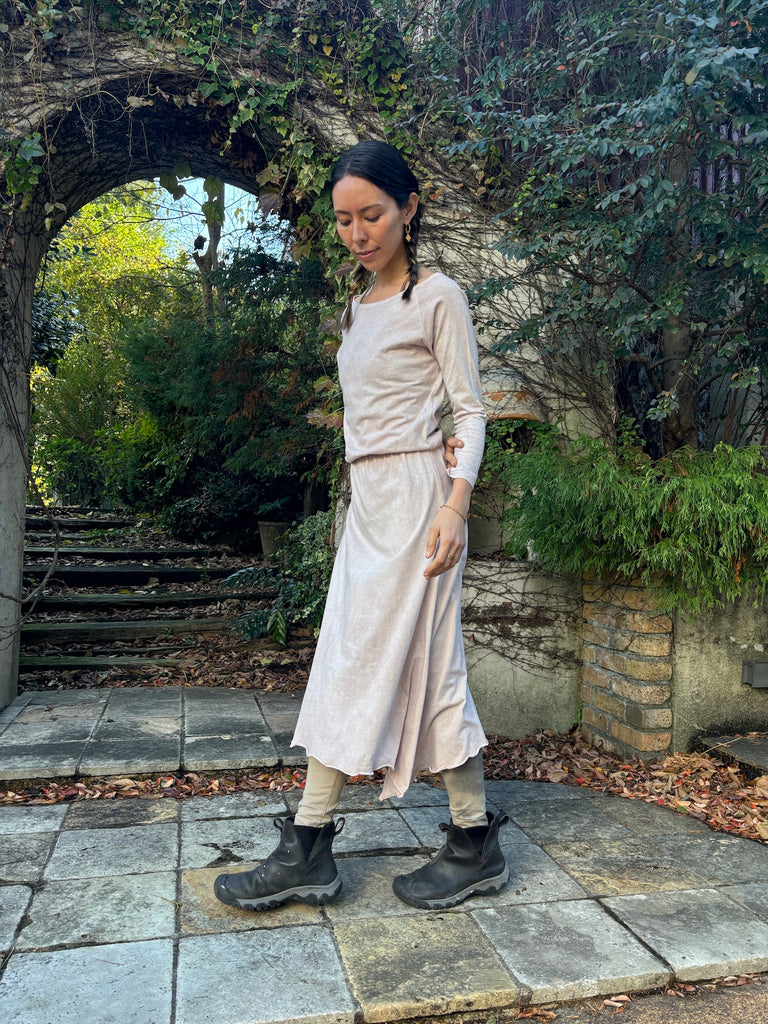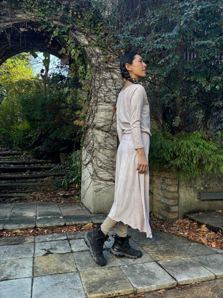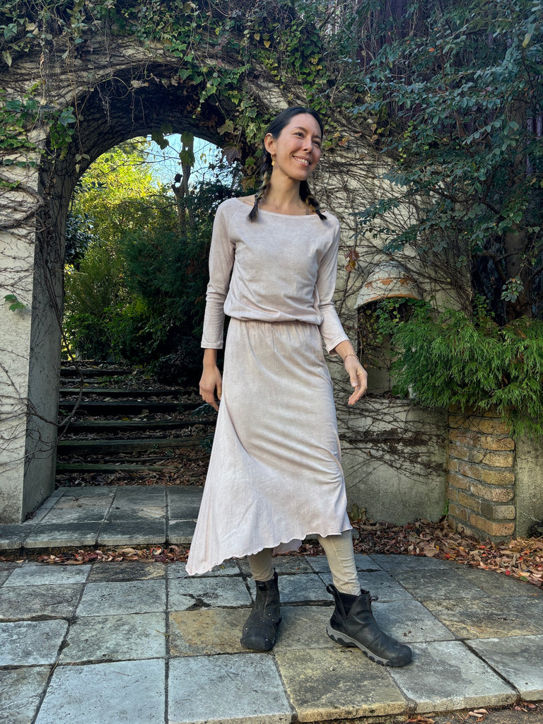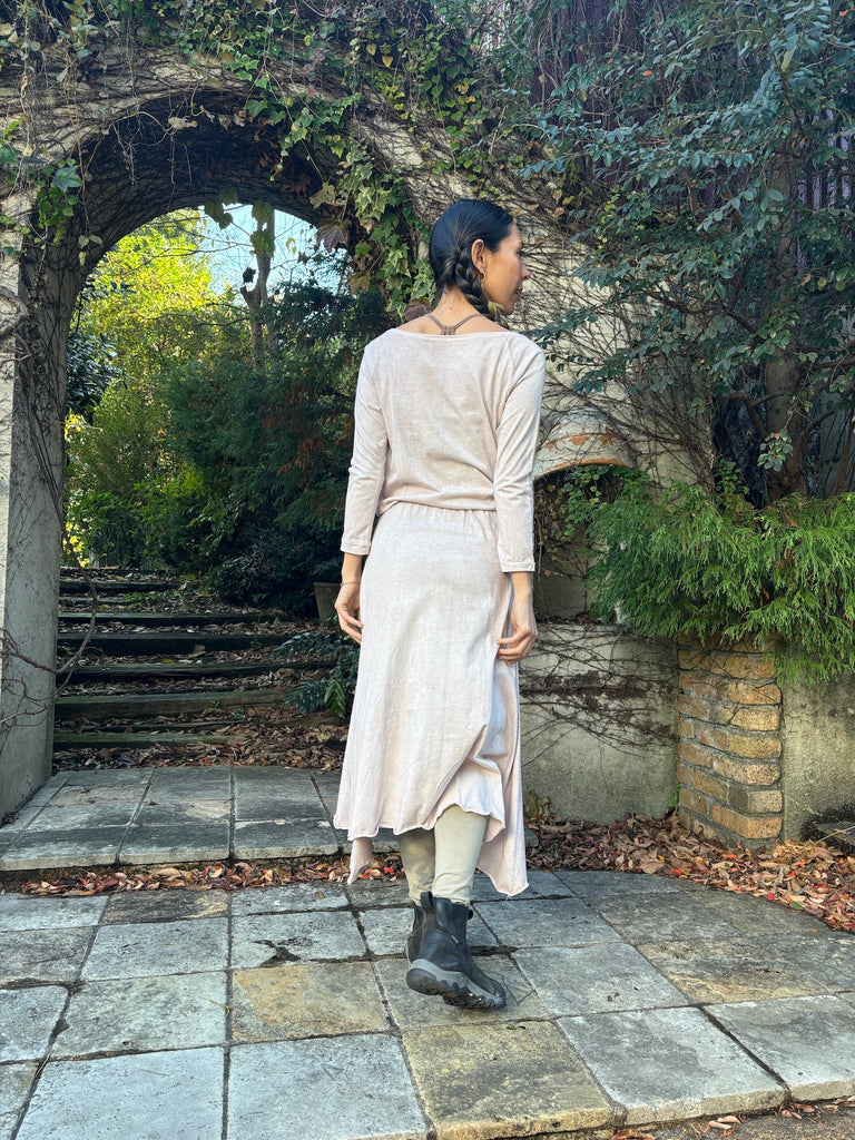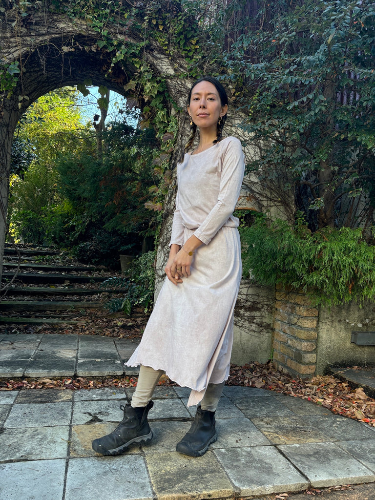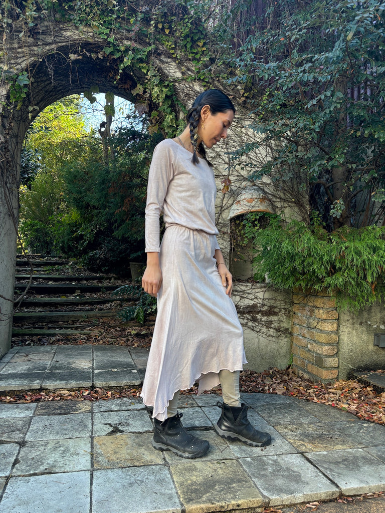 The discreet opening at the neck that makes your neck look beautiful, the sleeves that create a slender arm line, and the Goddess silhouette that spreads loosely from the cinched waist will lift your mood.