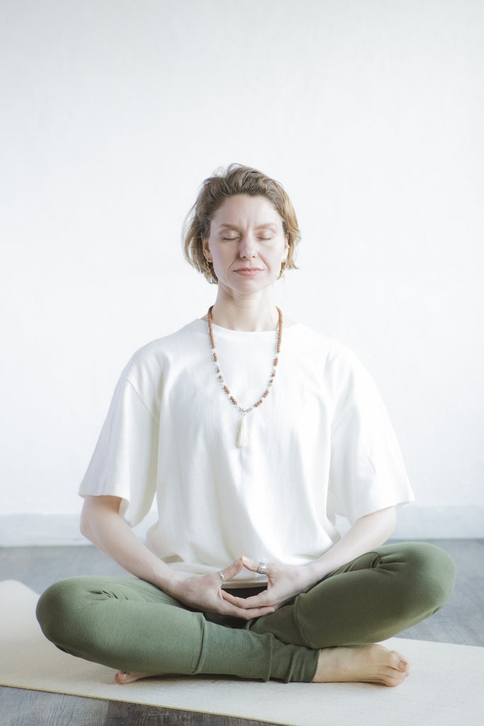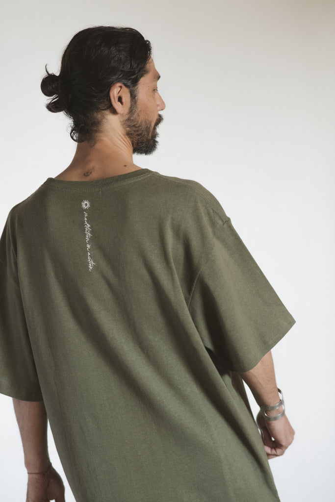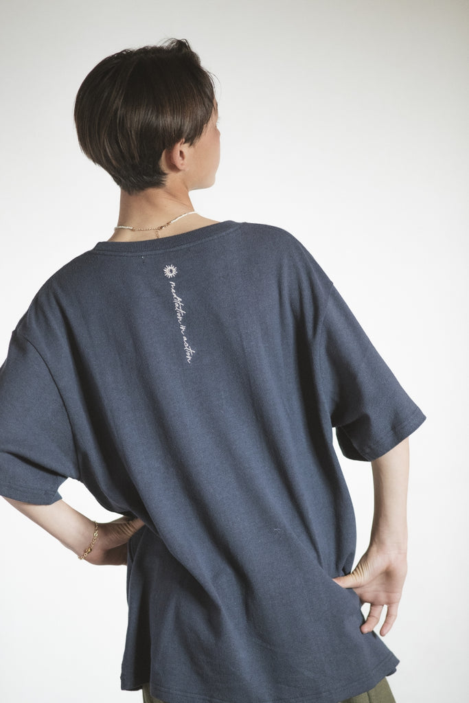 Embroidered along the spine is the phrase “Meditation in action” — a quiet reminder that every moment in daily life can be approached with awareness and stillness.